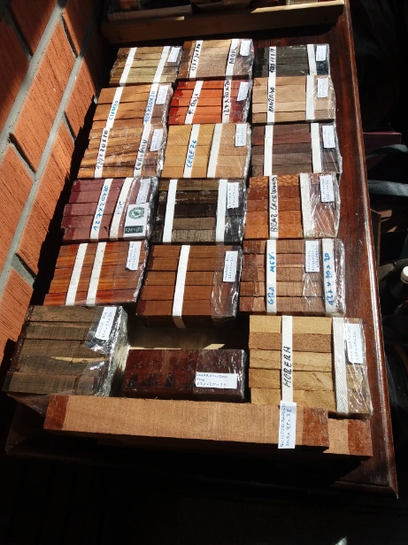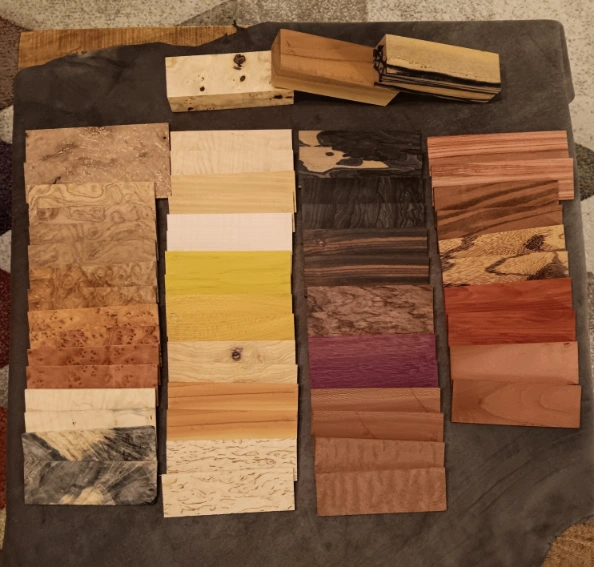 Massiivipuu: tammi, syreeni, kirsikka, omena ja kataja sekä eksoottisemmat puulajit, kuten eeben, ruusupuu, oliivipuu, wenge, käärmepuu, padauk, cocobolo ja ziricote. Eksoottiset puumateriaalit hankin vastuullisilta, kestävän kehityksen periaatteita noudattavilta toimijoilta Saksasta ja Espanjasta. Myös yksityishenkilöiden lahjoittamat kotimaiset puulajit saavat uuden elämän käsissäni.
